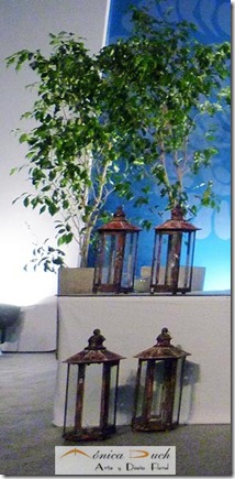 En un lateral del escenario sobre la esquina del frente, se ubicó un juego de faroles hindúes con velas y en el otro lateral un par de candelabros también hindúes, patinados en blanco con sus respectivas velas.